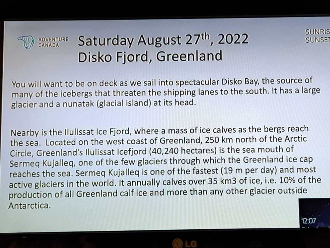 Info on Disko Fjord for Sat. Aug 27