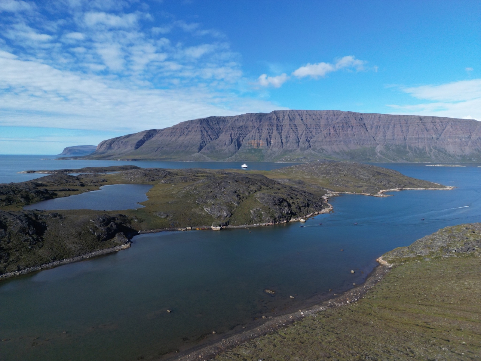 Drone - Ocean Endeavour & Disko Bay - Zodiac landing by red Kayaks